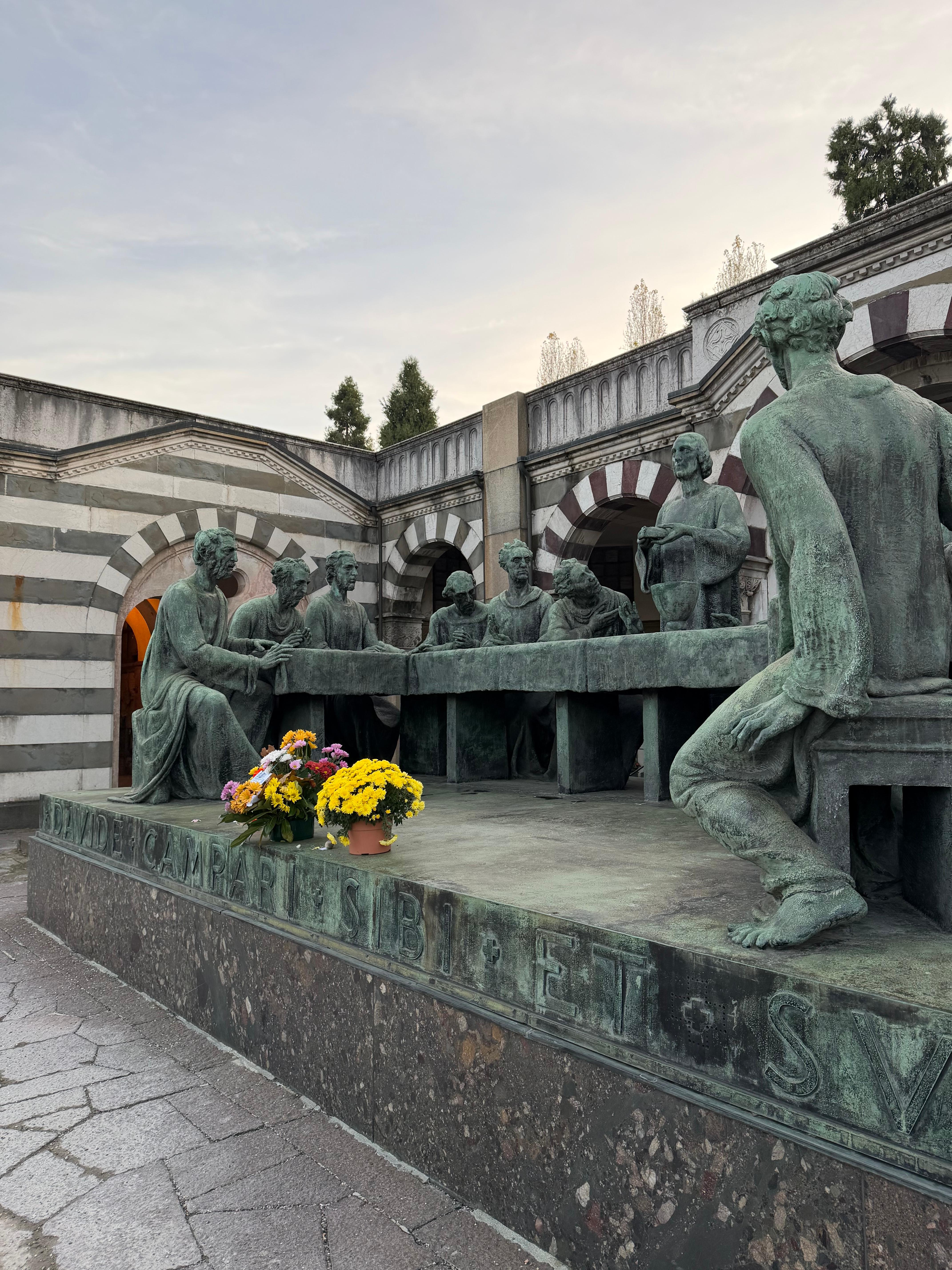 그 중에서도 가장 널리 알려진 것이 캄파리(Campari) 가문의 묘입니다. 레오나르도 다 빈치의 최후의 만찬을 주제로 제작된 거대한 청동 군상으로, 20세기 초 이탈리아 장례 예술과 당대 재력을 동시에 보여주는 작품으로 평가받고 있습니다. 그 옆으로는 로마의 트라야누스 원주에서 영감을 받아 제작된 기념 조각도 있는데, 100여 개의 실물 크기 조각이 십자가의 길을 따라가는 장면을 묘사하고 있습니다. 어두운 대리석들 사이에서 세라믹 타일로 제작된 날개 조각이 유독 눈에 띄었는데, 이는 영원과 부활의 상징이라고 합니다.
