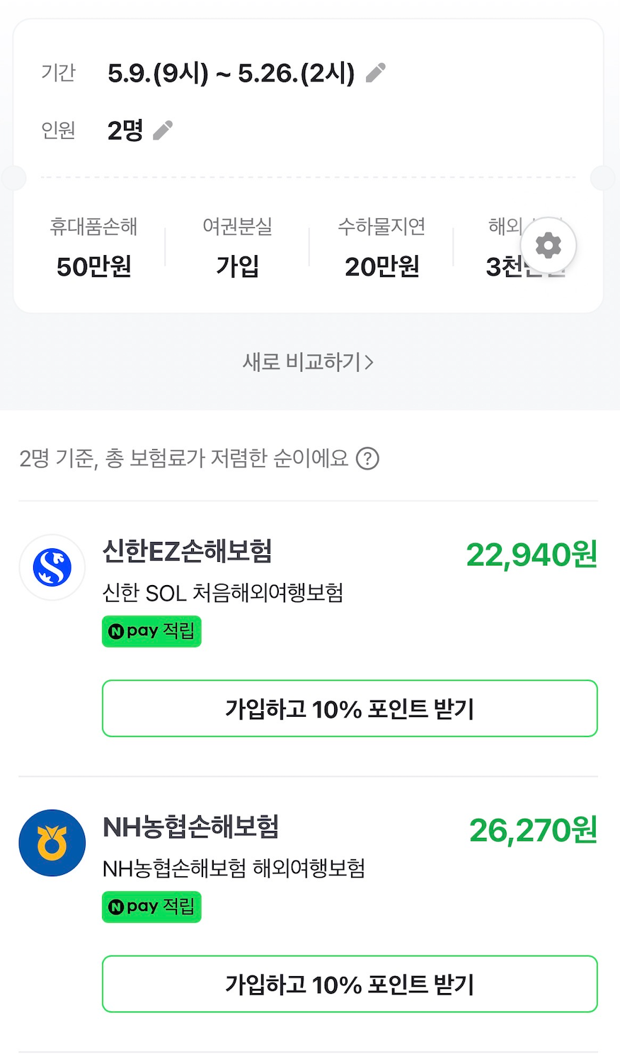 1) 네이버 페이 여행자 보험 비교하기 (최저가, N페이 적립)